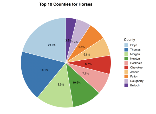 Horses had a Farm Gate Value of $290,453,217 in 2024, making up over 13.7% of livestock and aquaculture's farm gate value. The top three counties for training, boarding, and breeding horses were Floyd, Thomas, and Morgan.